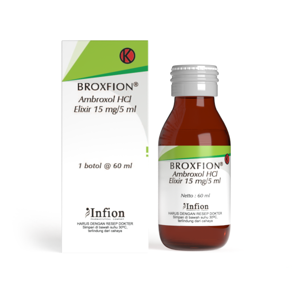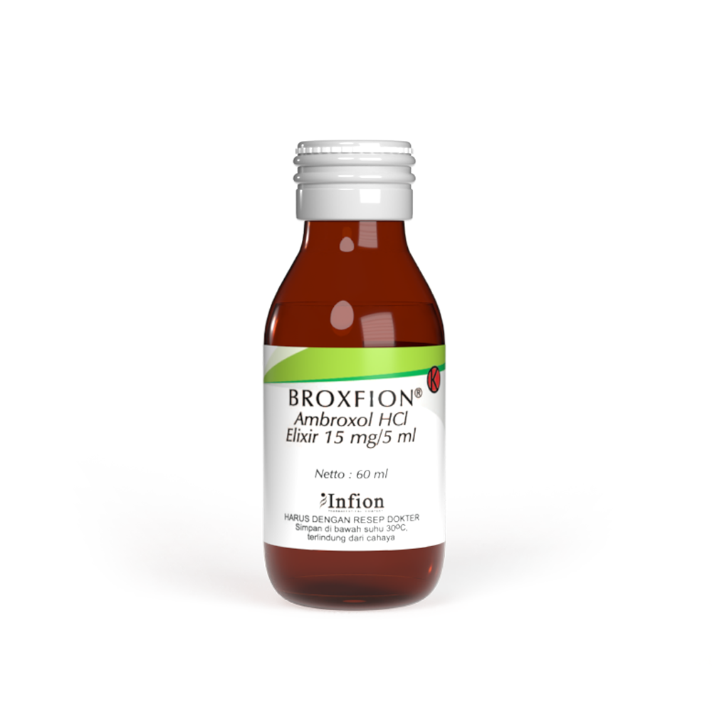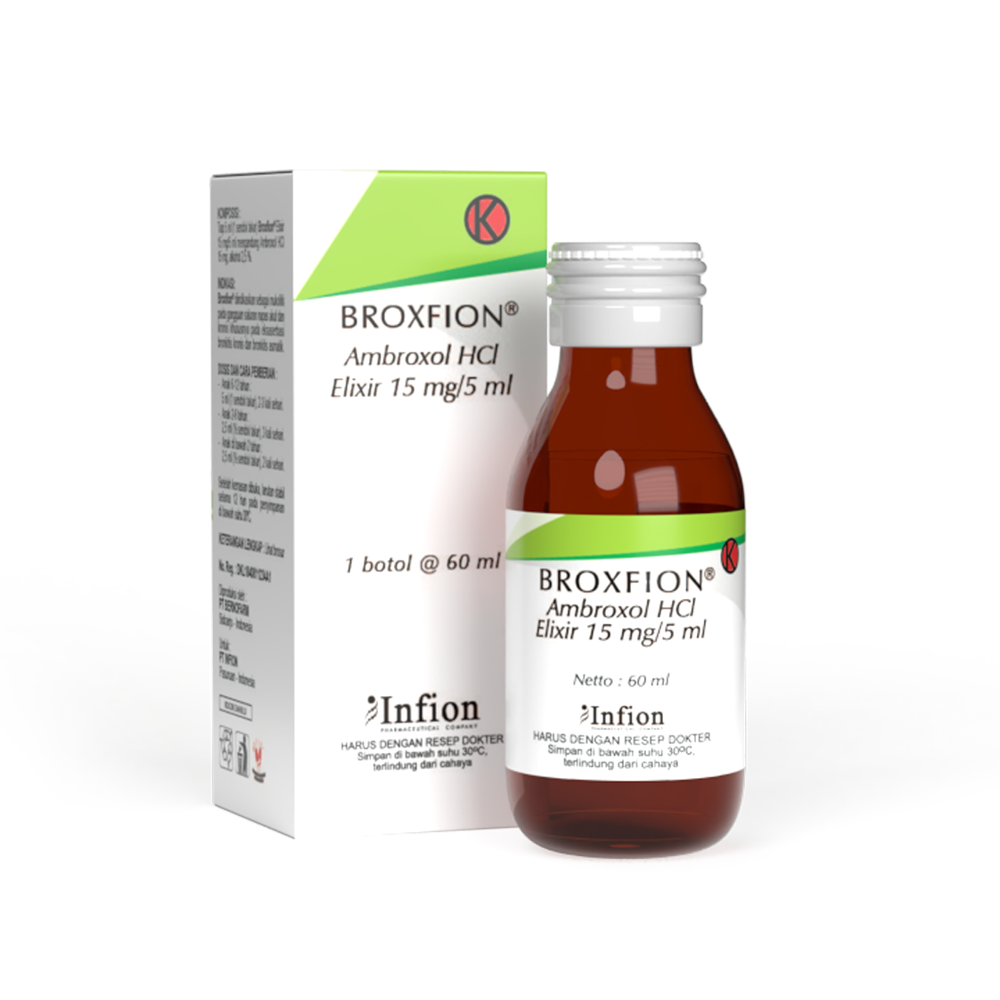 Tiap 5 ml (1 sendok takar) Broxfion® Elixir 15 mg/5 ml mengandung Ambroxol HCl 15 mg, alkohol 2,5%.